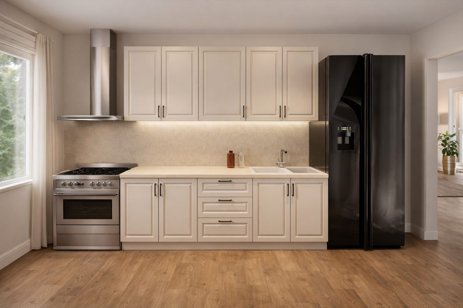 Electrocasnicele, bateria, chiuveta, banda LED și elementele decorative nu sunt incluse decât dacă este specificat altfel.