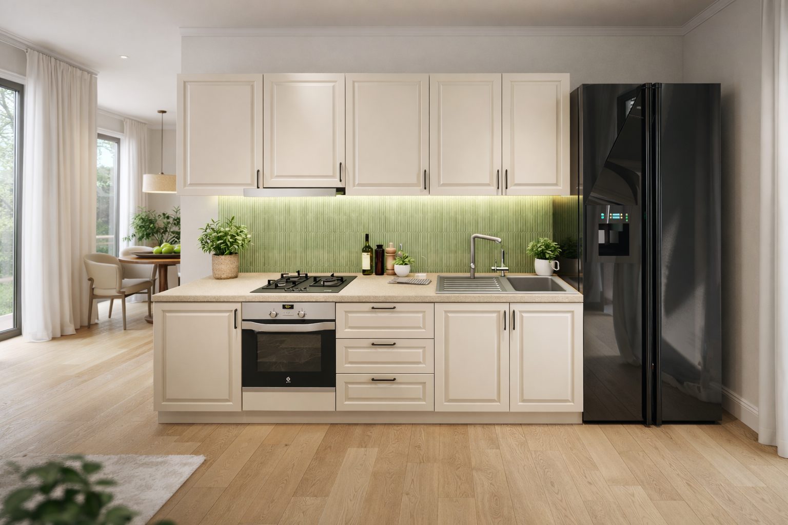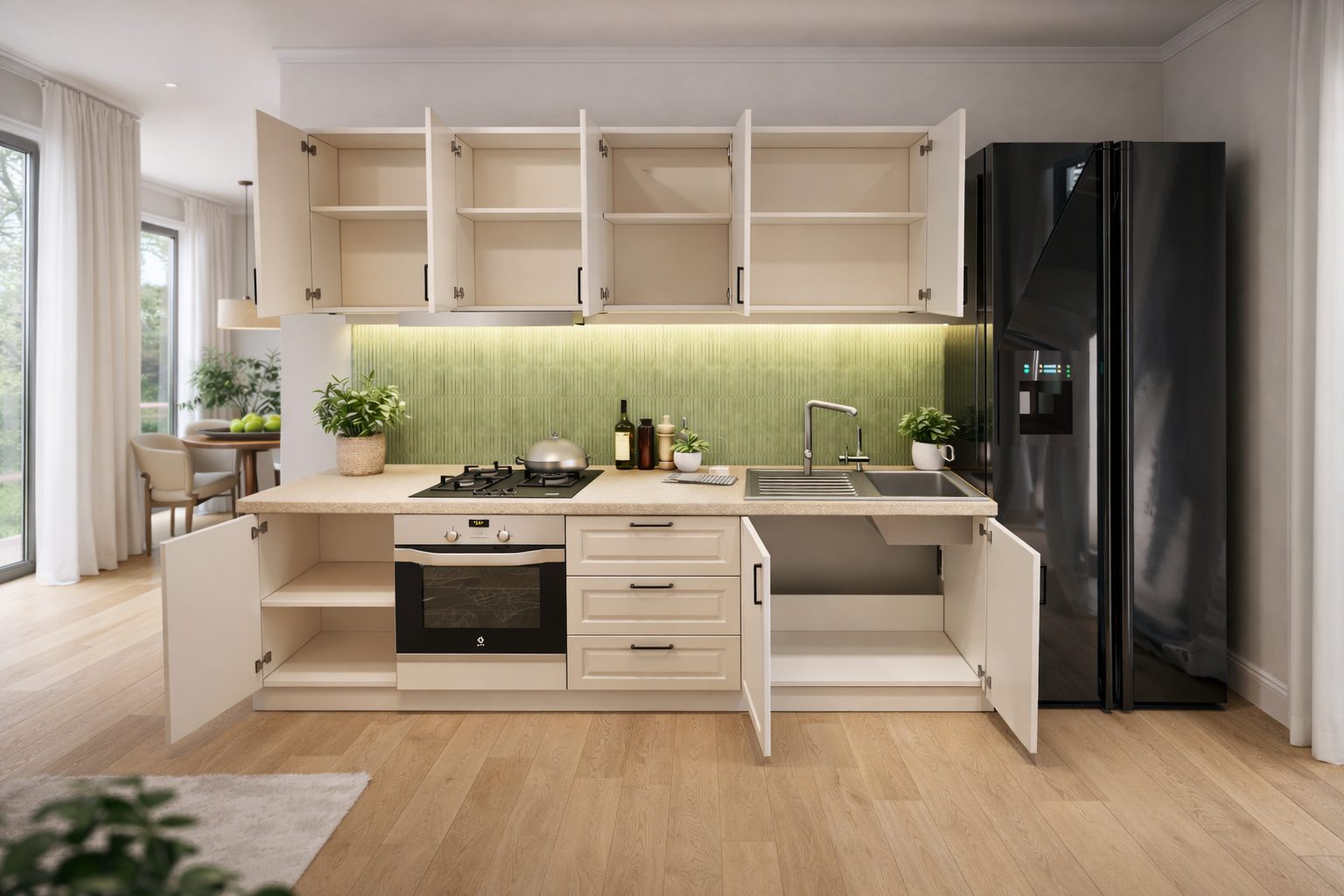 Electrocasnicele, bateria, chiuveta, banda LED și elementele decorative nu sunt incluse decât dacă este specificat altfel.