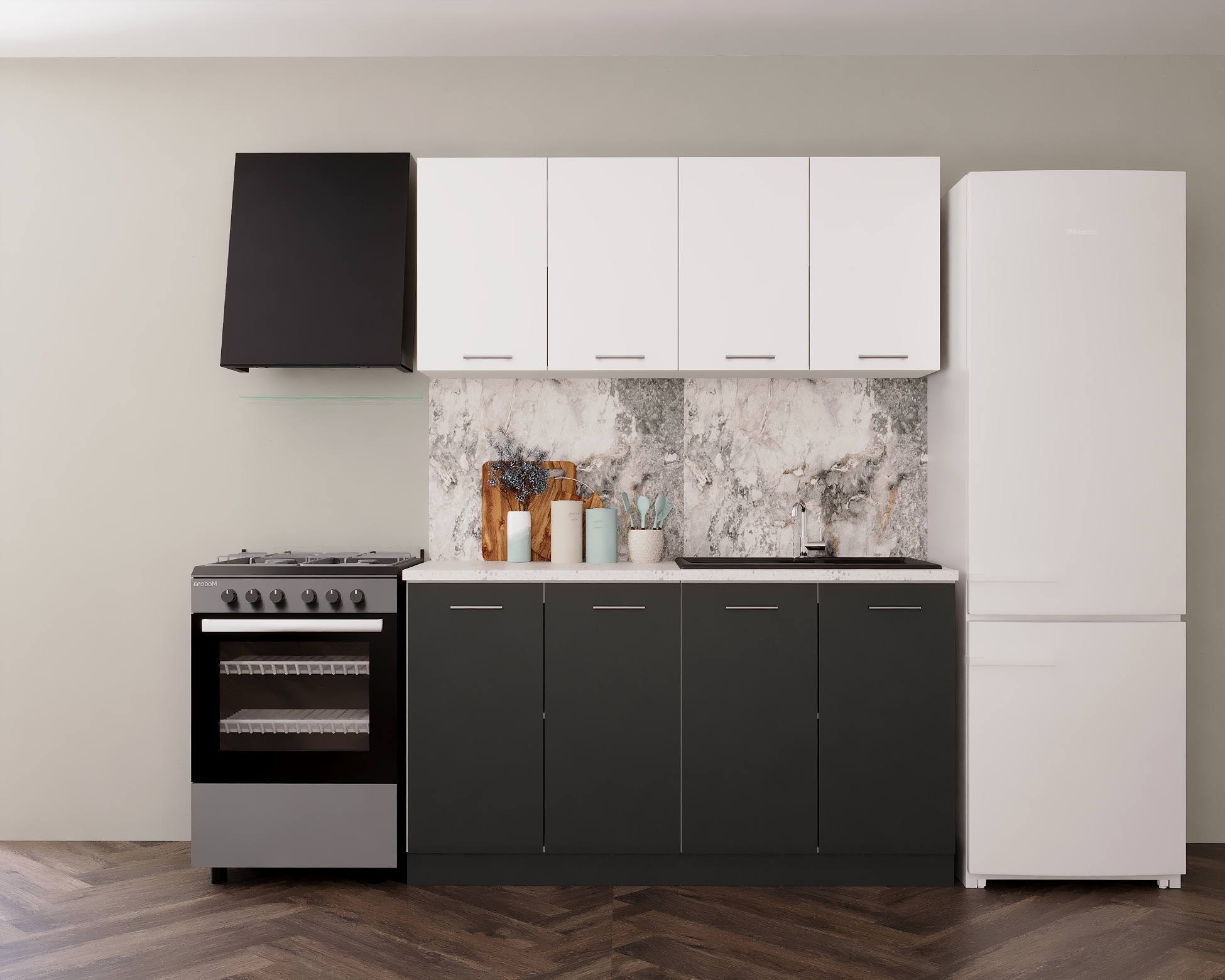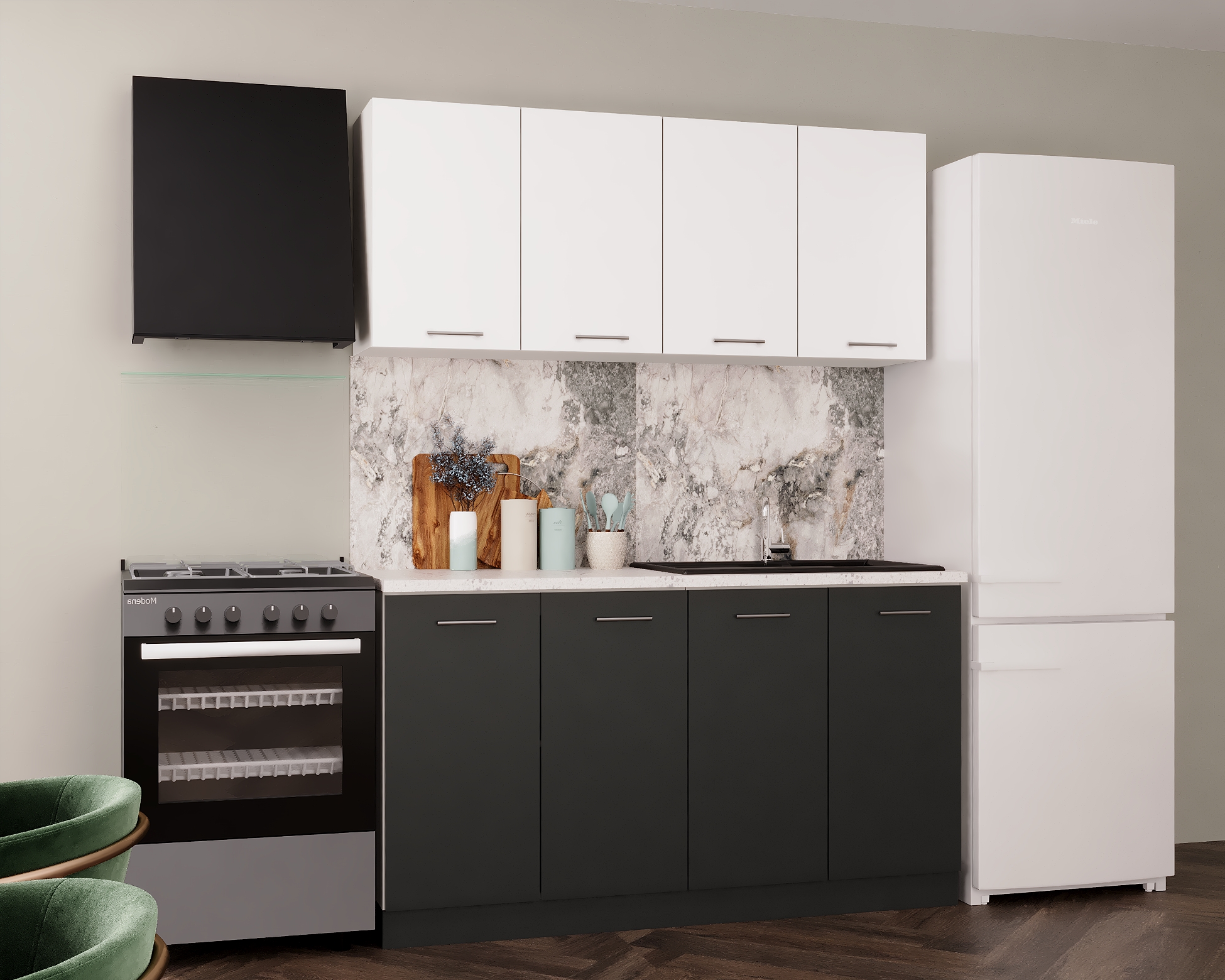 Acest set de mobilă modulară pentru bucătărie face parte din familia Marta și este conceput pentru bucătării compacte, apartamente sau garsoniere, unde este importantă utilizarea eficientă a spațiului fără a face compromisuri de design. Combinația cromatică antracit & alb oferă un aspect modern și luminos, ușor de integrat în amenajări contemporane.