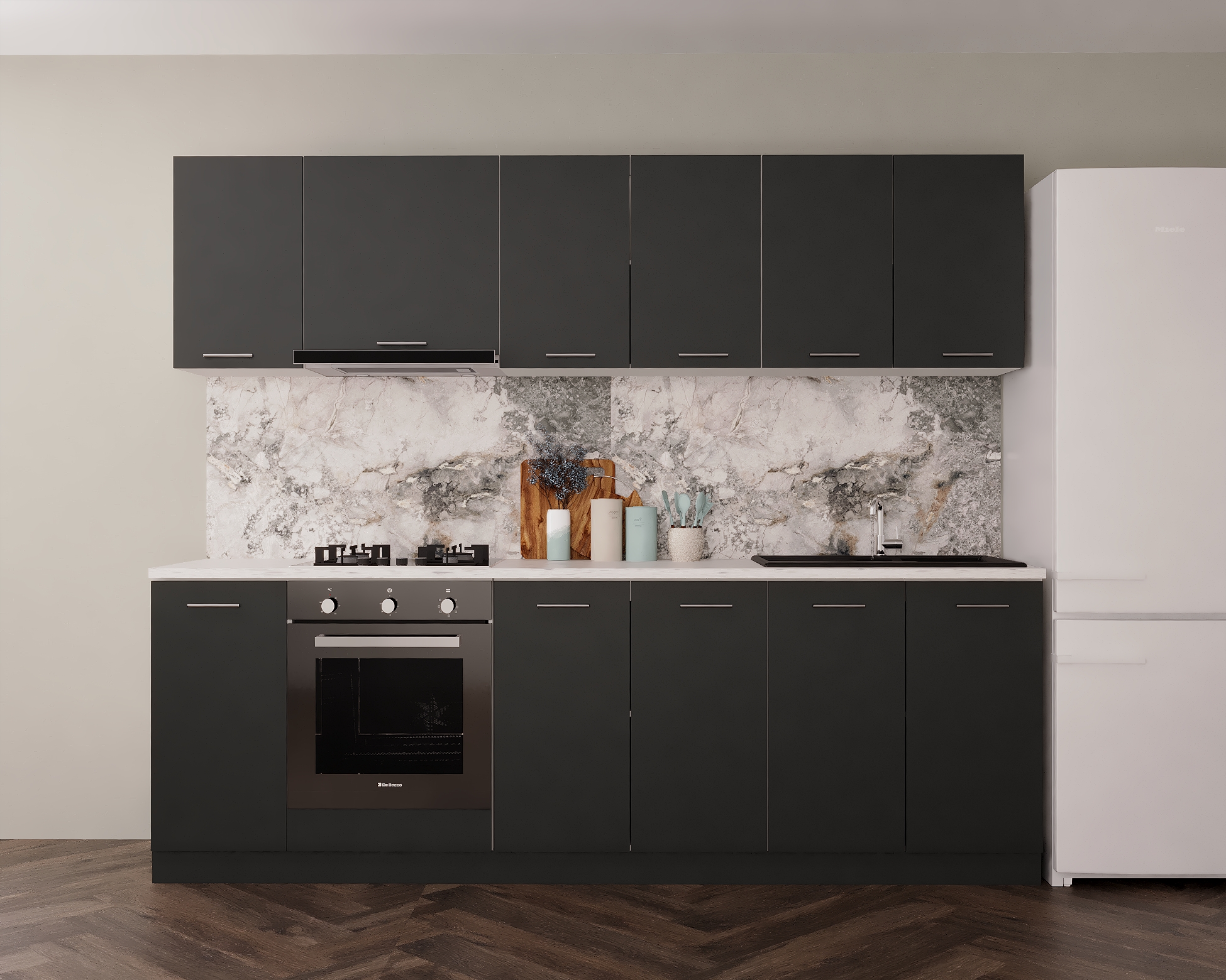 Acest set de mobilă modulară pentru bucătărie face parte din familia Marta și este destinat bucătăriilor spațioase, unde este necesară o capacitate mare de depozitare și o suprafață generoasă de lucru. Finisajul antracit oferă un aspect elegant, modern și uniform, ideal pentru amenajări contemporane și minimaliste.