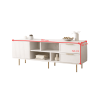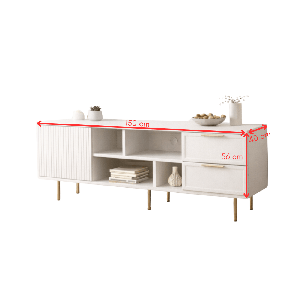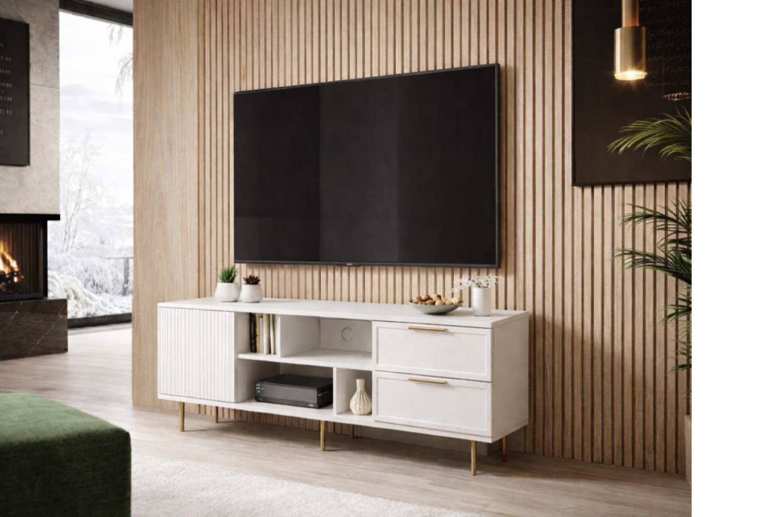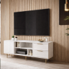 Albul deschide spațiul și face livingul să pară mai luminos. Comoda TV Soft în alb aduce un aspect curat și aerisit, potrivit în interioare minimaliste sau scandinave, fără să domine vizual camera.