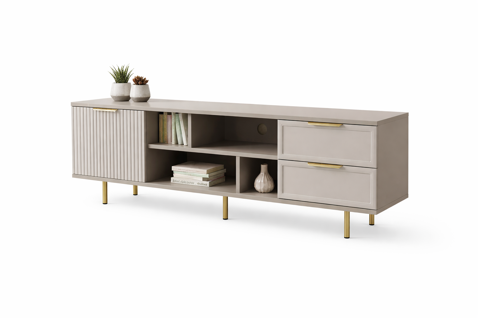 Fronturile din MDF vopsit oferă o suprafață netedă, rezistentă și ușor de întreținut. Carcasa din PAL de 18 mm în culoare cașmir asigură stabilitate și un aspect cald, rafinat. Mânerele și picioarele metalice aurii adaugă un accent sofisticat și o notă de lux.