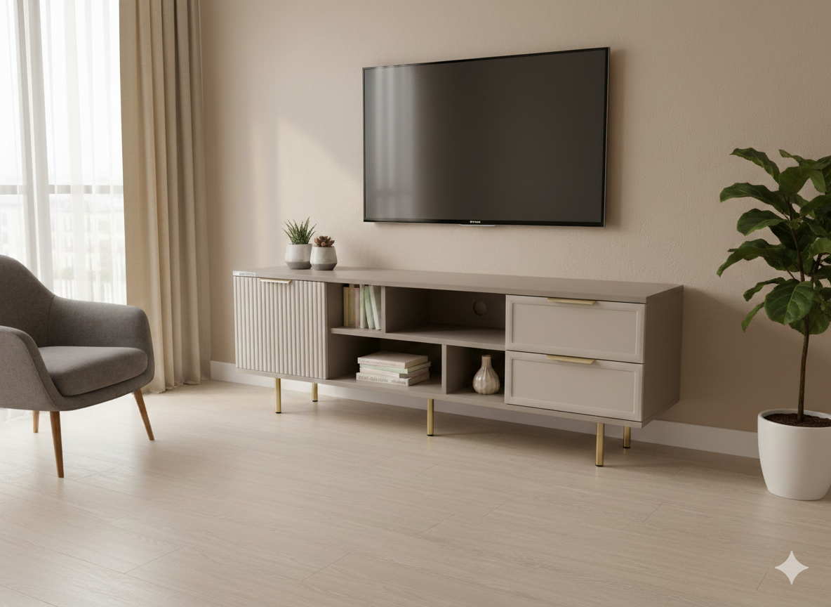 Compartimentarea practică, cu sertare și spații deschise, permite organizarea eficientă a echipamentelor multimedia și a accesoriilor decorative.