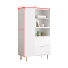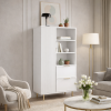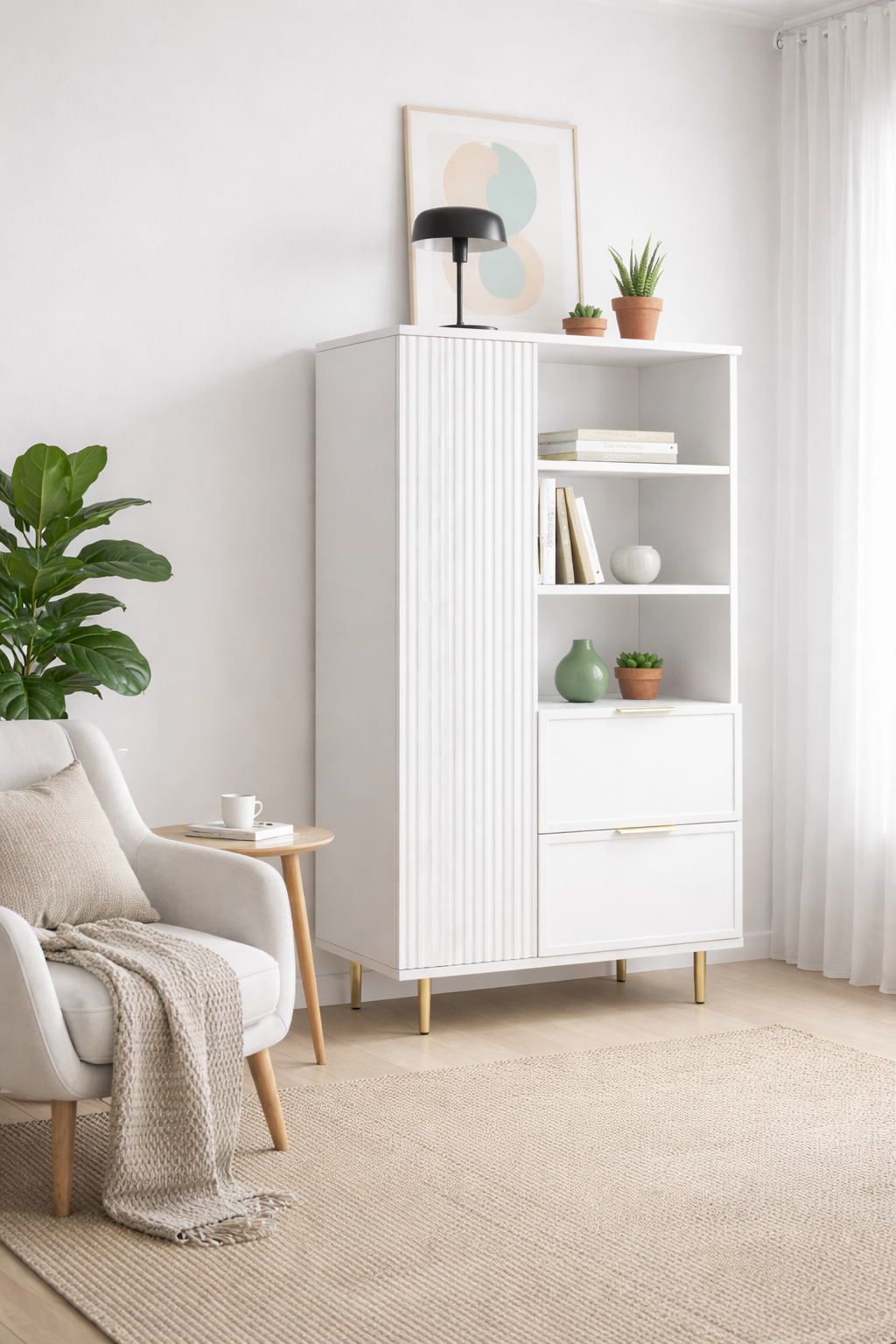 Fronturile din MDF frezat și vopsit în alb, picioarele și mânerele aurii adaugă un caracter aparte — elegant fără să fie ostentativ. Potrivit pentru living, dormitor sau birou. Se livrează flat-pack, cu toate accesoriile de montaj incluse.