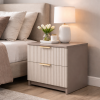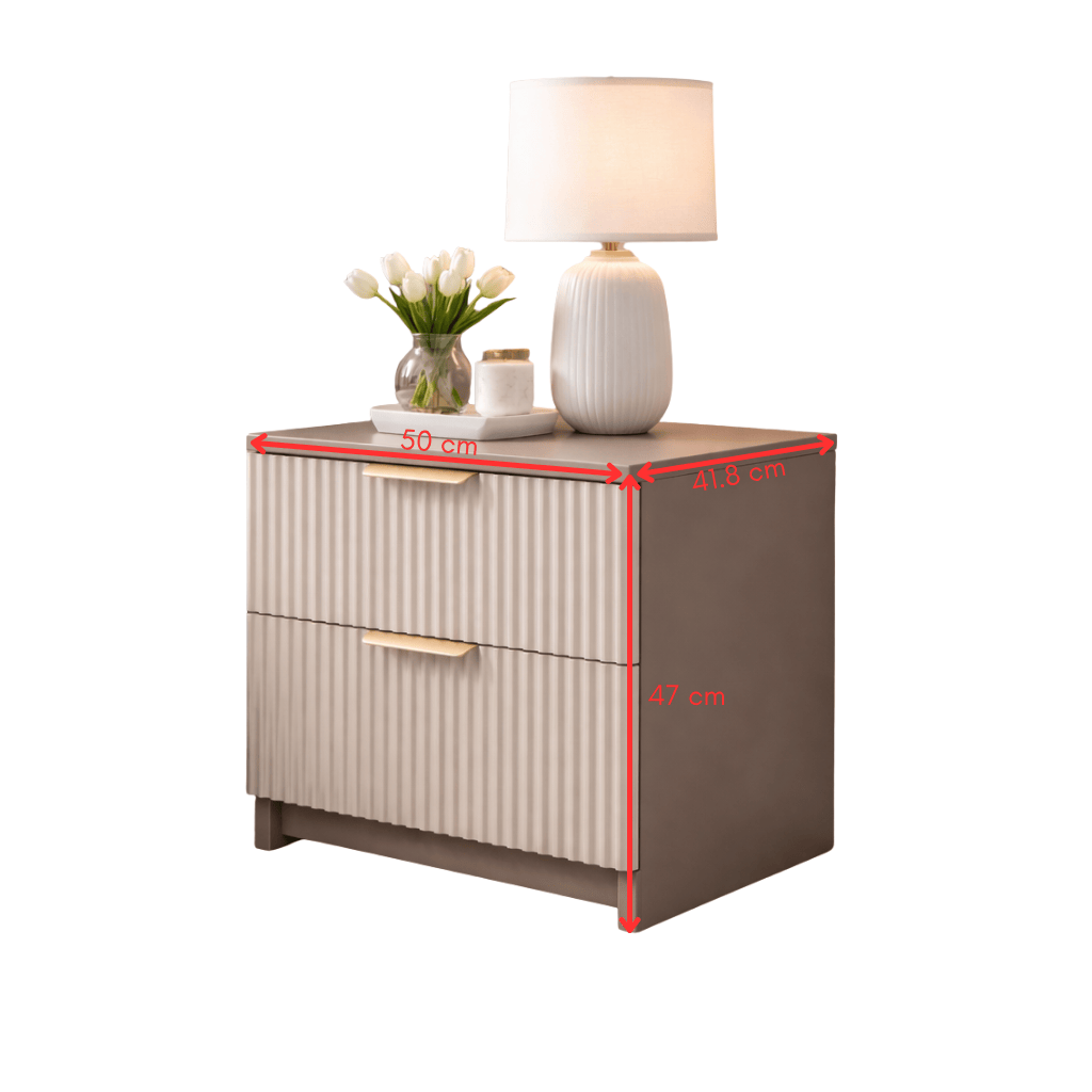 Este prevăzută cu două sertare spațioase, ideale pentru depozitarea obiectelor esențiale de lângă pat. Mânerele metalice cu finisaj auriu completează designul cu un accent discret de lux, fără a încărca vizual mobilierul.
