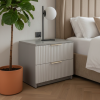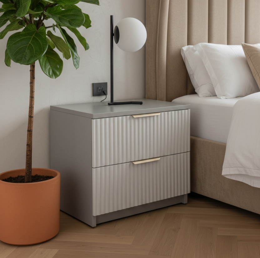 Această noptieră modernă este realizată cu carcasă din PAL cașmir de 18 mm, oferind stabilitate și un aspect elegant, potrivit dormitoarelor contemporane. Fronturile din MDF vopsit, cu riflaj vertical fin, adaugă personalitate piesei și creează un efect vizual rafinat.